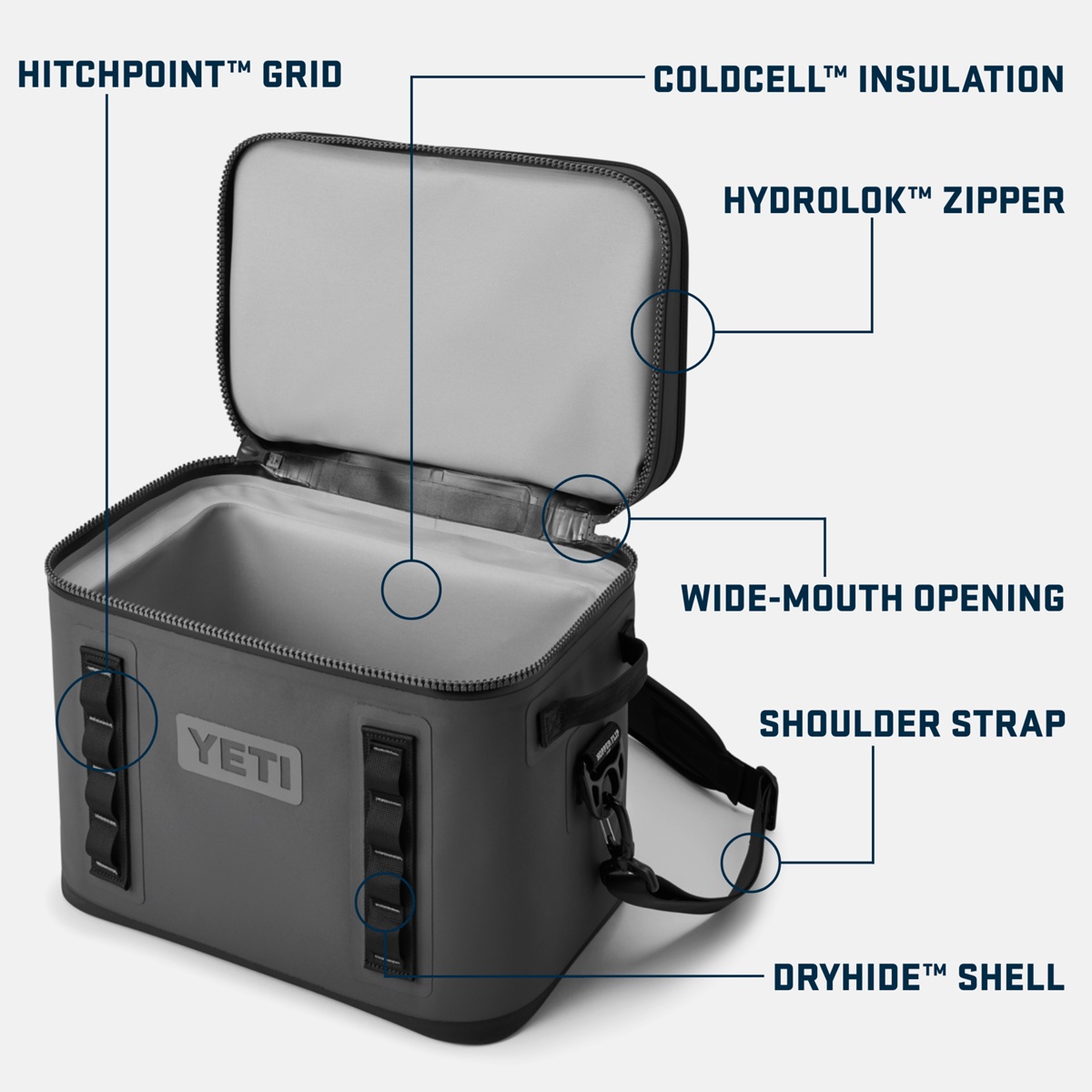 Carry a day's worth of lunch and a six-pack or more for you and your crew. The weekend is calling, so pack up your Hopper Flip? 18 and head for the hills. The bigger build suits your larger hauls and longer expeditions. Set out with your lunch while you work for your dinner, and have a couple cold ones to kick back with after. Hopper Flip? 18 is durable, leakproof, and versatile with the HitchPoint Grid for tools and accessories. And like all YEtheTI? Coolers, it's equipped with superior insulation to keep the cold for days.