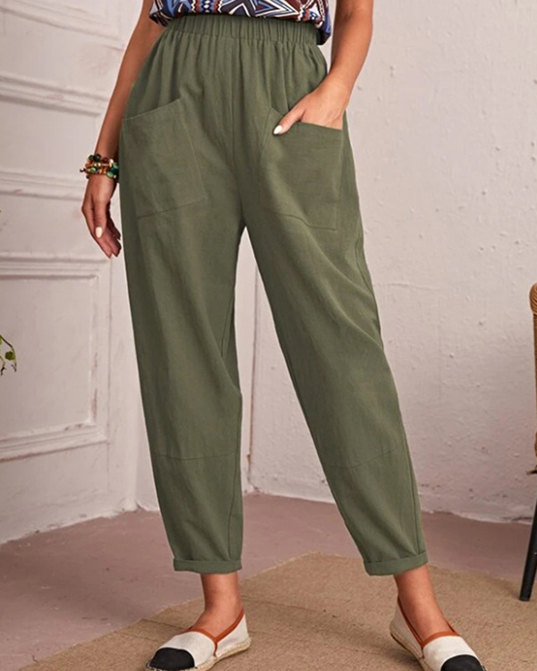 Casual Solid Pocket Elastic Waist Linen Pants