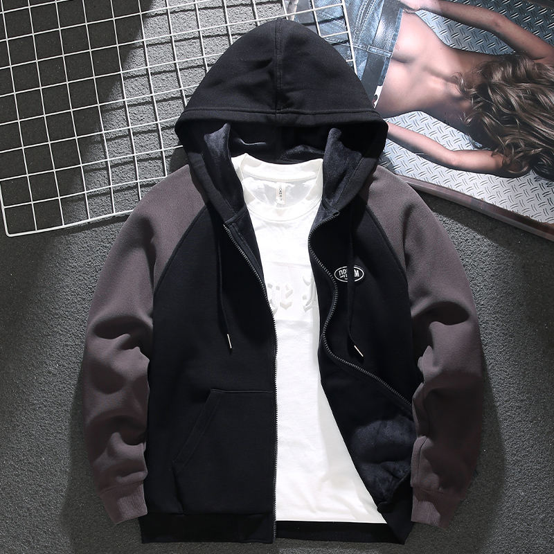 American style color-blocked hooded cardigan sweatshirt men's autumn and winter new velvet thickening loose plus fat enlarged raglan jacket