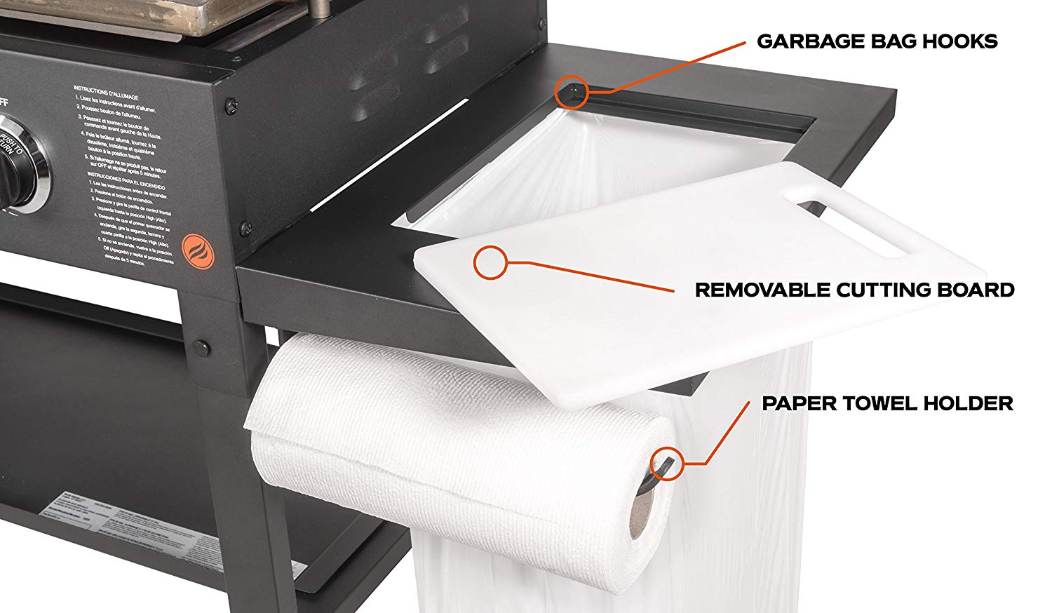 The BLACKtheSTONE 36" Griddle Cooking Station with Accessory Side Shelf gives you the control you need to be an outdoor cooking pro. Four independently-controlled heat zones offer 60,000 BTUs of heat to give you all the power you need to serve an entire crowd with restaurant-quality steaks, or up to 28 burgers or 72 hot dogs! Enjoy all the benefits of a standard 36" griddle with the added convenience of a cutting board, garbage bag hanger, and paper towel holder, making prep and clean-up a cinch. Now fully equipped with the patented rear grease management system. Join the Griddle Nation and cook anything, anytime, anywhere with a BLACKtheSTONE.