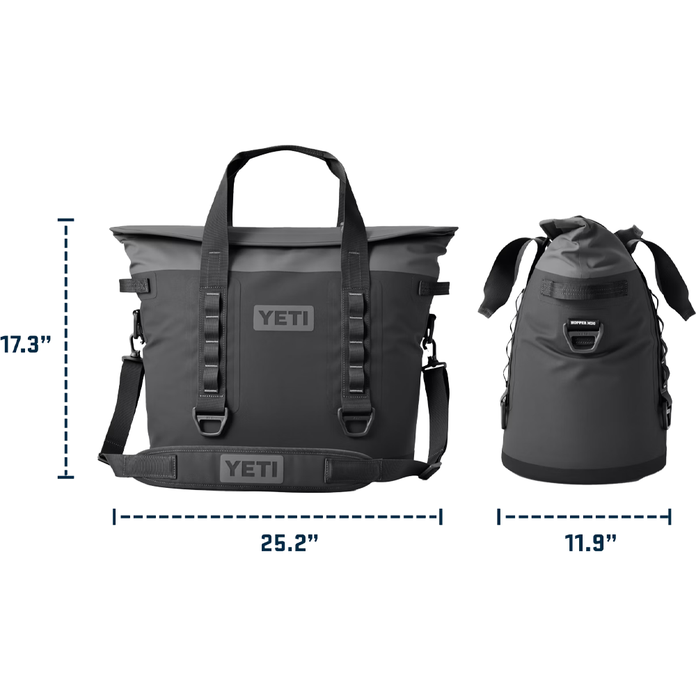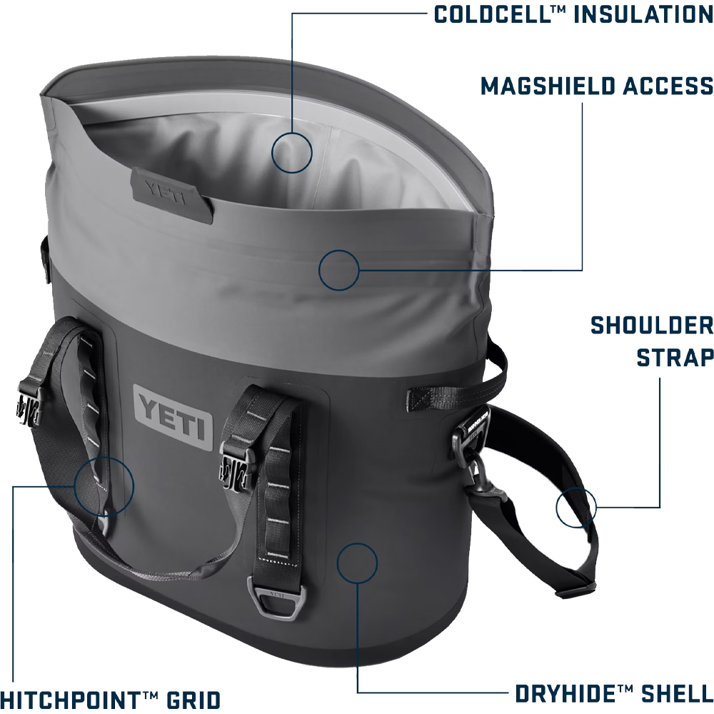The improved Hopper? M30 continues to shine as the tough-as-nails soft cooler. Completely re-engineered with MagShield Access, the extra-wide mouth top stays open when needed, making it easier than ever to load and unload food and drink for weekend excursions. Equipped with a strip of ultra-strong magnets, the top seals tight and locks cold in, while the Quick-Release Buckles add an extra layer of protection. And like the rest of the Hopper? Soft Coolers, the Hopper M30's built in Hitchpoint Grid lets you attach accessories like the Rambler Bottle Sling and SideKick Dry? Gear Case for extra utility on the go.