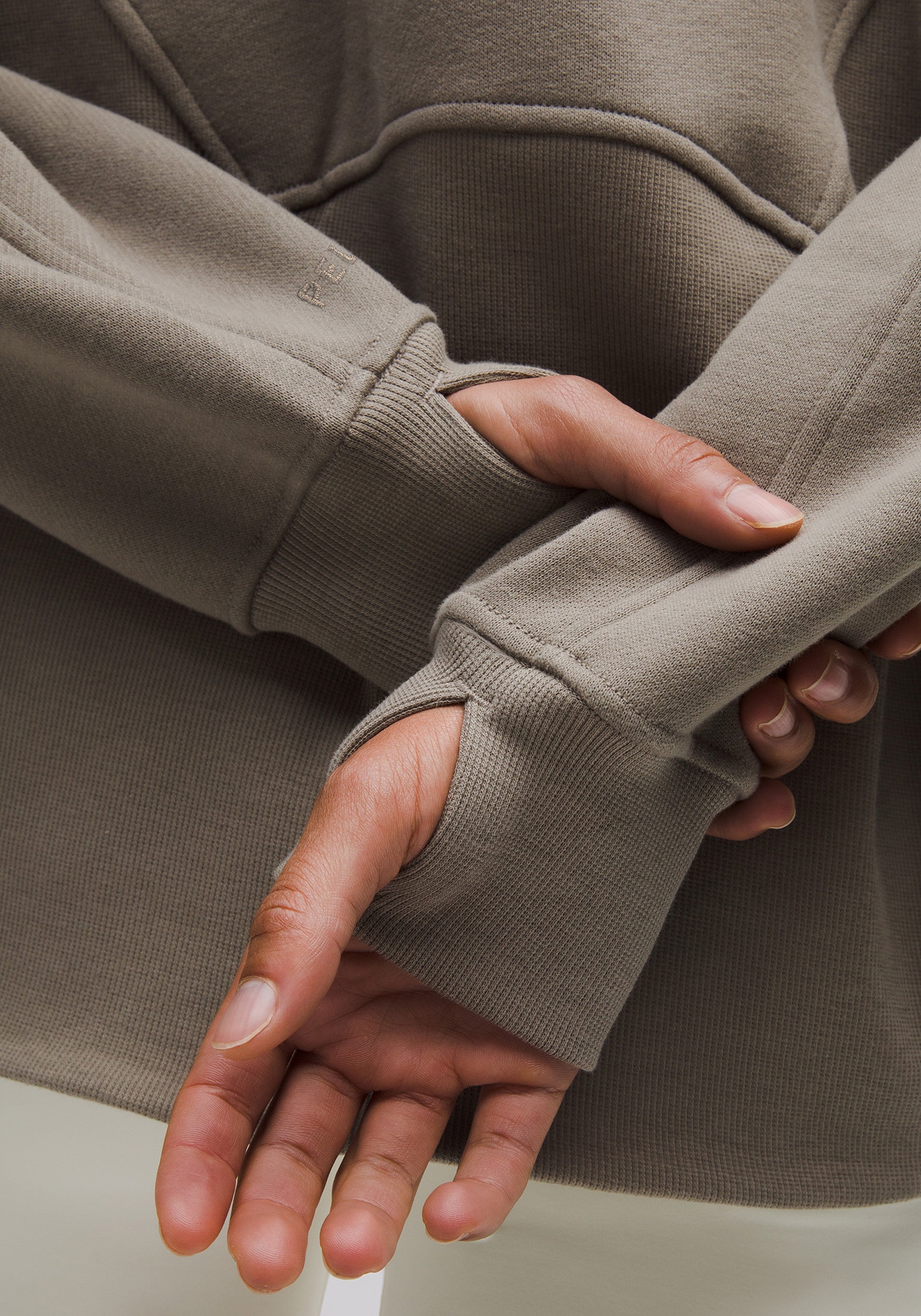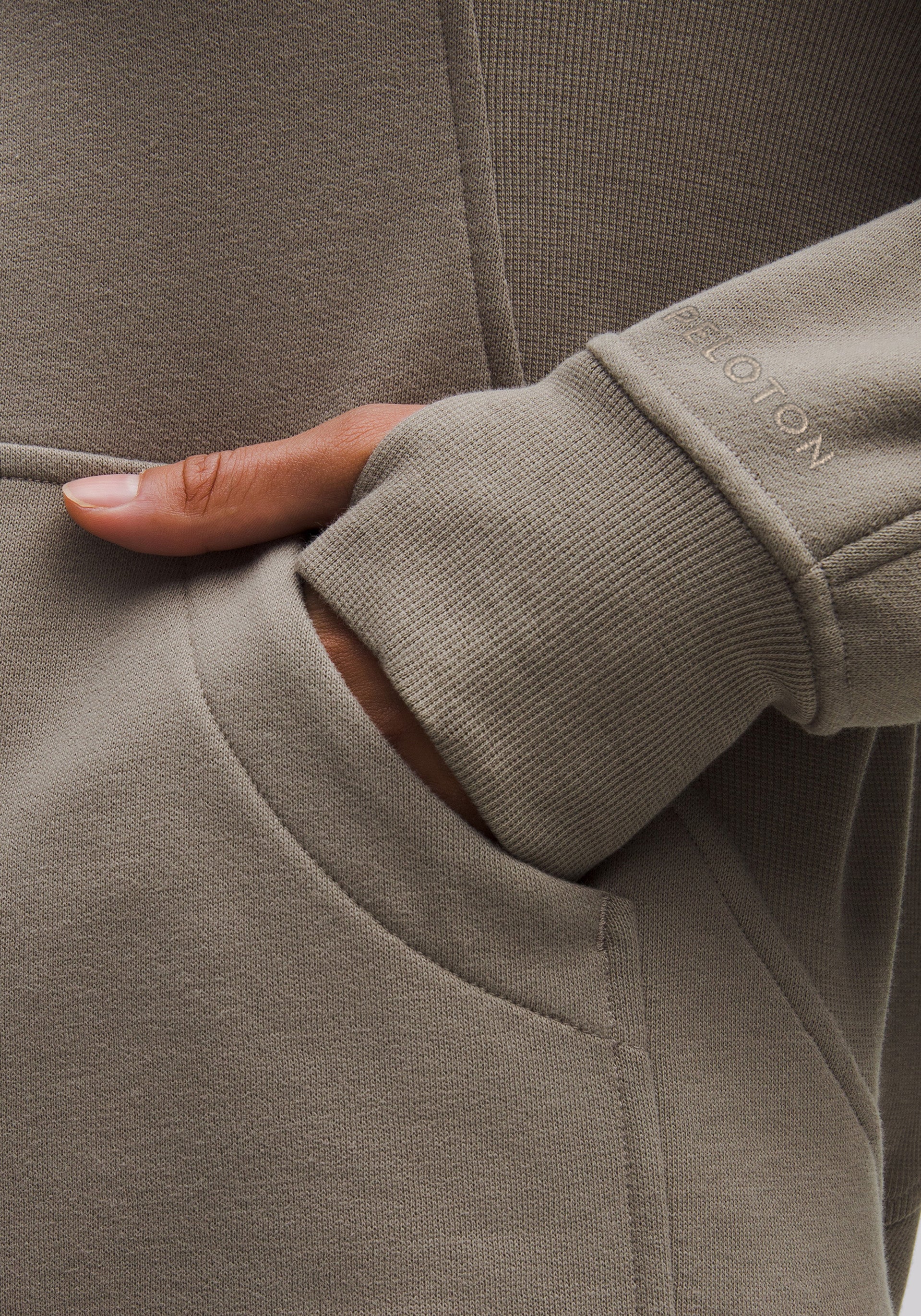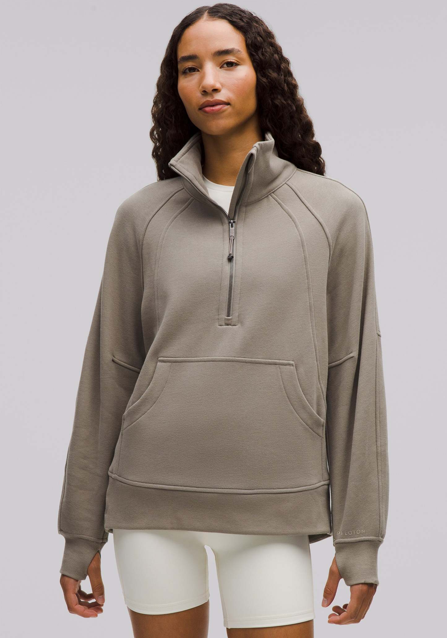 High neck, half-zip pullover with elastic zipper pull that doubles as an emergency hair tie, kangaroo pocket with hidden phone sleeve, zipper garage, and thumbholes