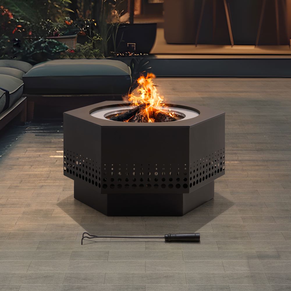 SUNJOY 28 Inch Hexagon Stainless Steel Smokeless Fire Pit with PVC Cover and Poker - Dot Pattern